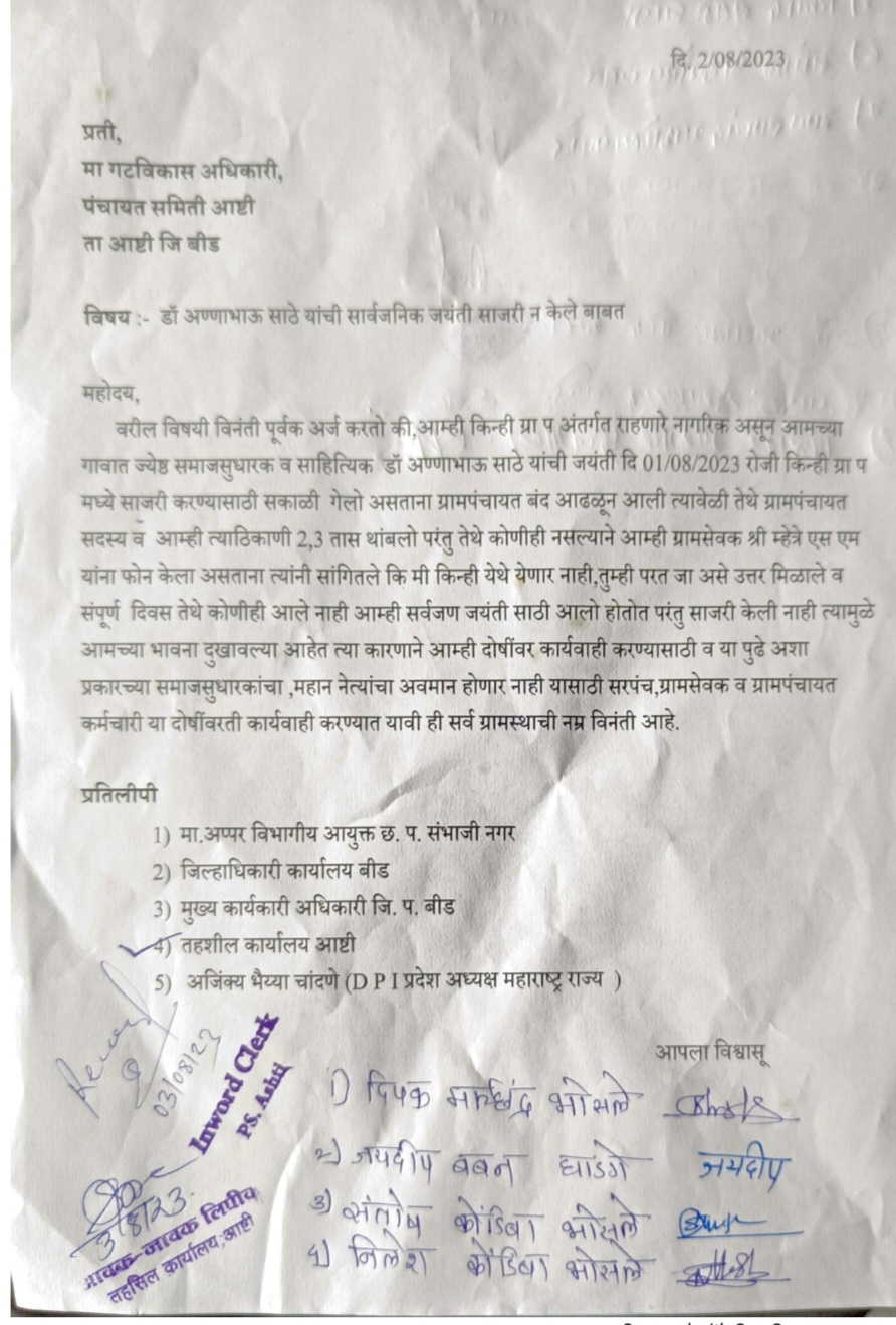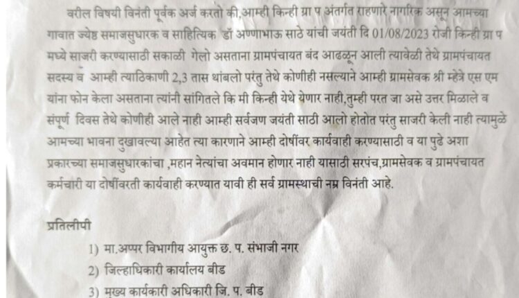 क्लिक2आष्टी अपडेट-लोकशाहीर अण्णाभाऊ साठे यांची सार्वजनिक जयंती सर्व महाराष्ट्रभर साजरी केली असताना आष्टी तालुक्यातील किन्ही येथील ग्रामपंचायत कार्यालयात लोकशाहीर आण्णाभाऊ साठे यांची जयंती साजरी करण्याचा विसर पडल्याची तक्रार ग्रामस्थांच्यावतीने निवेदनाद्वारे आष्टीचे गटविकास अधिकारी यांच्याकडे केली आहे.या निवेदनाद्वारे ग्रामसेवक यांच्यासह संबंधितावर कारवाई व्हावी अशी मागणी ग्रामस्थांनी केली आहे.