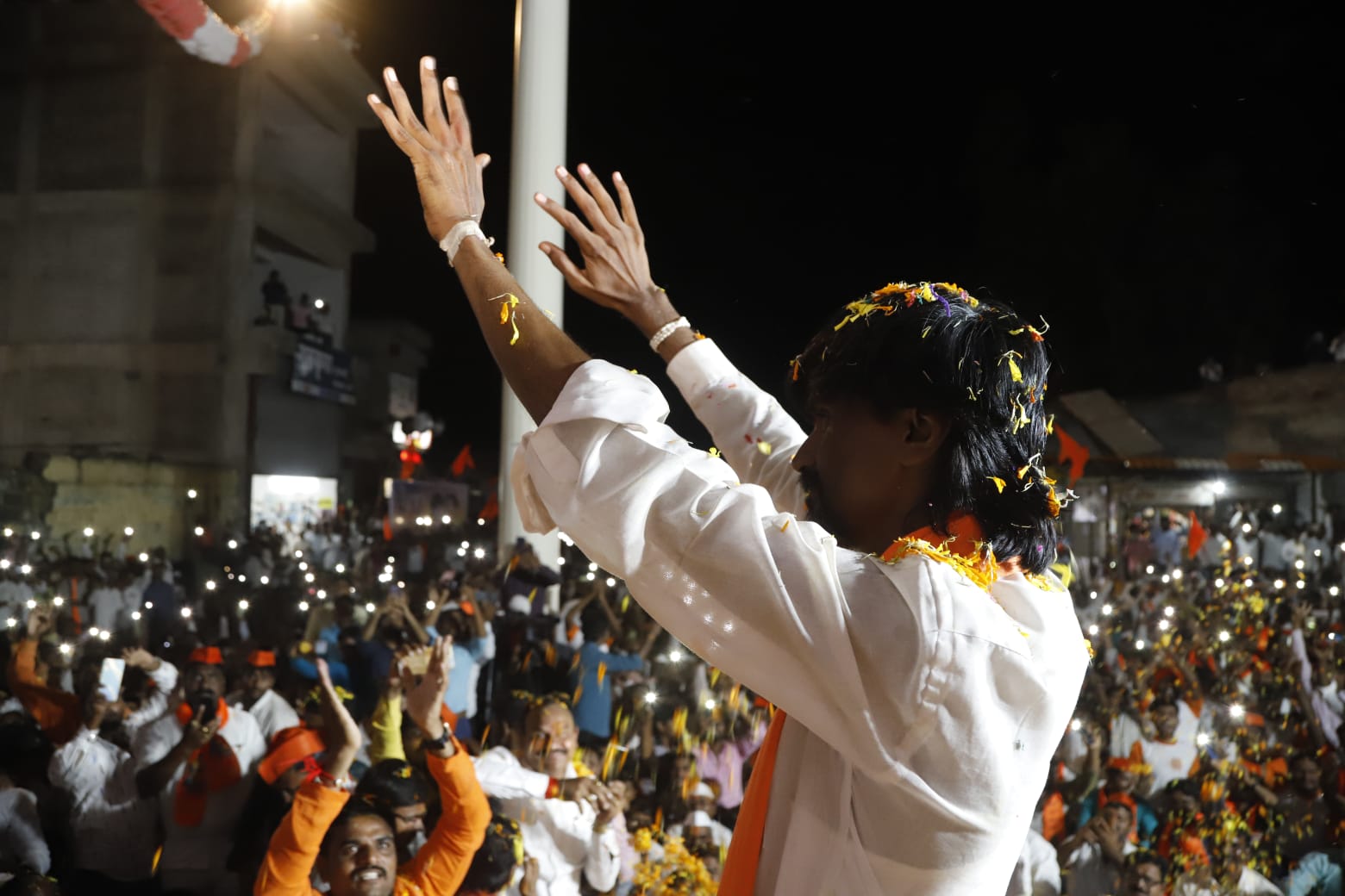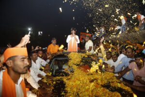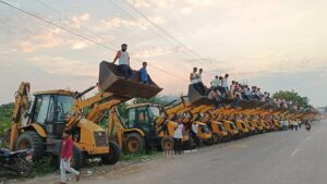 ५० जेसीबी ने ५ क्विंटल फुलांची उधळण करत केले स्वागत
