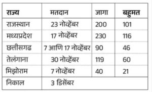 राजस्थान,मध्यप्रदेश,छत्तीसगड,तेलंगणा व मिझोरम राज्यांच्या विधानसभा निवडणूकीचे बिगूल वाजले