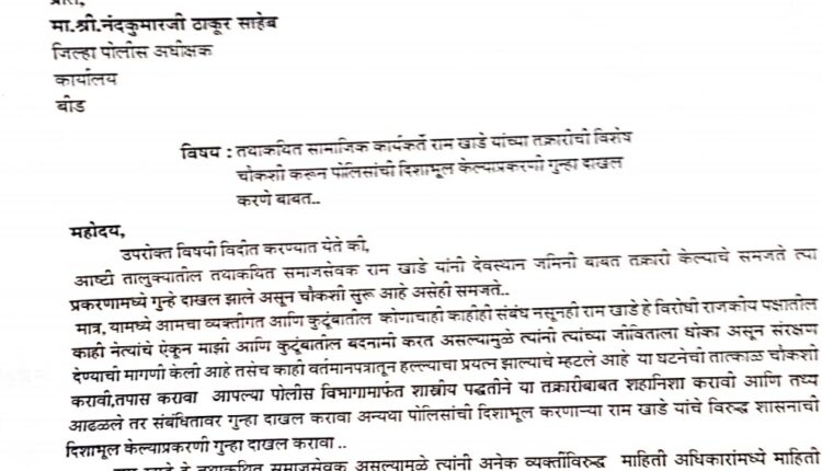 असल्यास या वाहनाचा मालक,चालक आणि वाहनामध्ये कोणी होते काय ? याची शास्त्रीय पद्धतीने चौकशी करण्यात यावी.तसेच सुपे या गावापर्यंत या वाहनातून पाठलाग करण्यात आला अशी कपोलकल्पित कहाणी राम खाडे यांनी रचली आहे.राम खाडे यांनी यापूर्वी अनेक व्यक्तींच्या माहिती अधिकारामध्ये माहिती मागवलेली असल्यामुळे त्यांना अनेक दुश्मन आहेत त्यामुळे बीड जिल्हा पोलीस अधीक्षकांनी आष्टी तालुक्यातील अंभोरा पोलीस स्टेशनचे प्रभारी अधिकारी सहाय्यक पोलीस निरीक्षक यांना या प्रकरणी चौकशीचे तात्काळ आदेश द्यावेत आणि या कपोल कल्पित तक्रारीमध्ये तथ्य न आढळल्यास शासनाची,पोलिस विभागाची दिशाभूल करून जनतेतून निवडून आलेल्या लोकप्रतिनिधीची बदनामी करणाऱ्या राम खाडे याच्यावर गुन्हा दाखल करण्यात यावा असे निवेदनात म्हटले आहे.