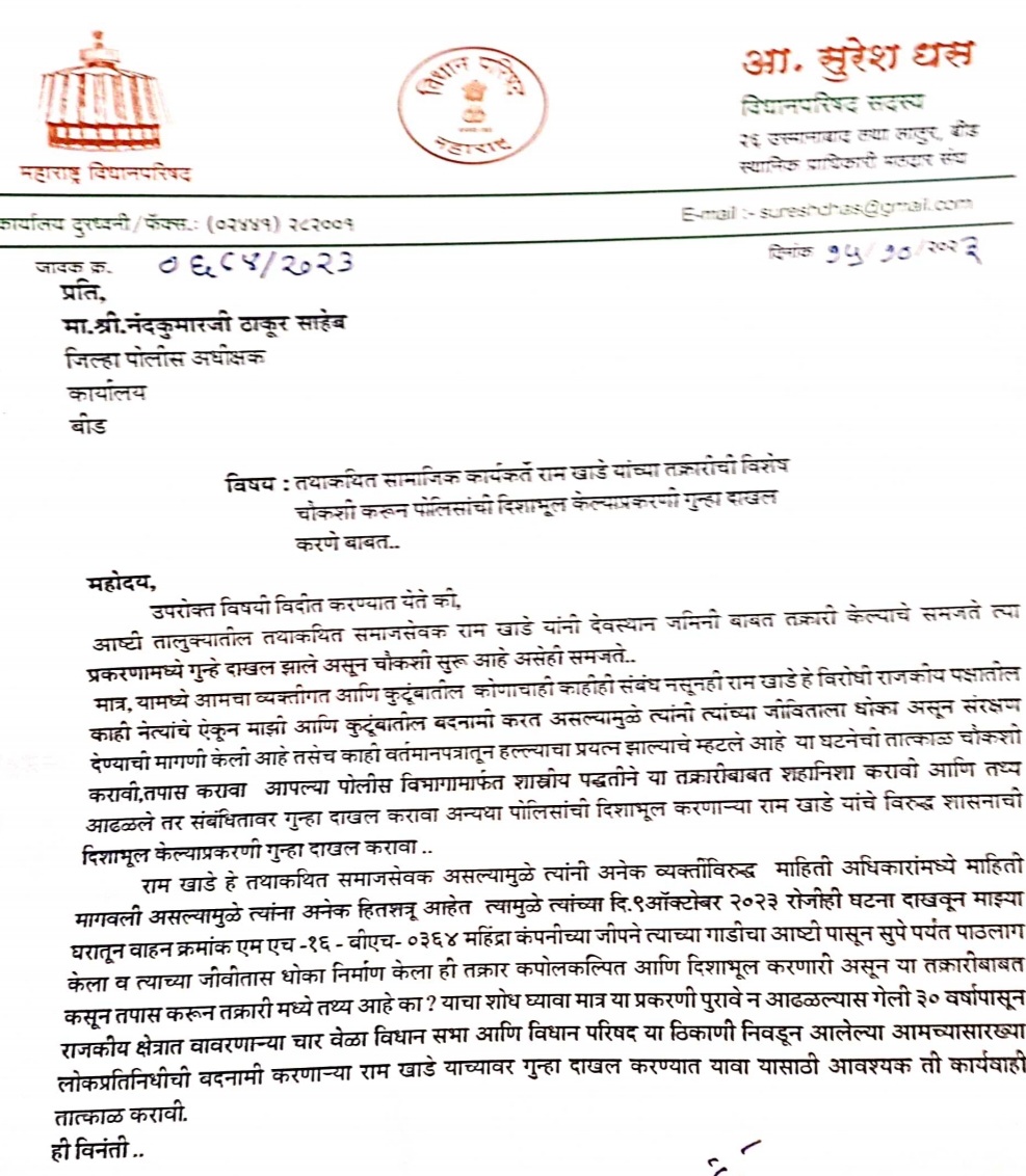 जिल्हा पोलिस अधिक्षकांकडे दिलेल्या तक्रारी मध्ये आ.धस यांनी म्हटले की,राम खाडे यांनी आष्टी तालुक्यातील देवस्थान इनाम जमिनीच्या बाबत तक्रारी केल्या असून त्याबाबत गुन्हेही दाखल झाले आहेत.असे समजते या प्रकरणांशी आपला आणि कुटुंबीयांचा काहीही संबंध नसताना राम खाडे हे विरोधी पक्षातील असल्यामुळे त्यांच्या पक्षातील काही नेत्यांचे ऐकून विनाकारण आपली बदनामी करत आहेत.गेली ३० वर्षे आपण राजकारणात सक्रिय असून ३ वेळा विधानसभा आणि १ वेळ विधानपरिषद या निवडणुका जिंकलेल्या आहेत.अशा राजकारणी व्यक्तीला बदनाम करण्यासाठी राम खाडे हे सतत प्रयत्नशील असतात त्या मध्ये दि.९ ऑक्टोबर २०२३ रोजी माझ्या घरातून निघालेले एम एच-१६- ए बी ३६५ या महिंद्रा कंपनीच्या वाहन कोणाचे आहे?आणि खरोखरच त्यादिवशी हे वाहन माझ्या घरातून येऊन गेले आहे काय?