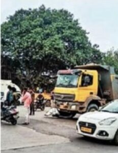 चंदननगर पुणे येथील अपघातातील डंम्पर दिसत आहे.