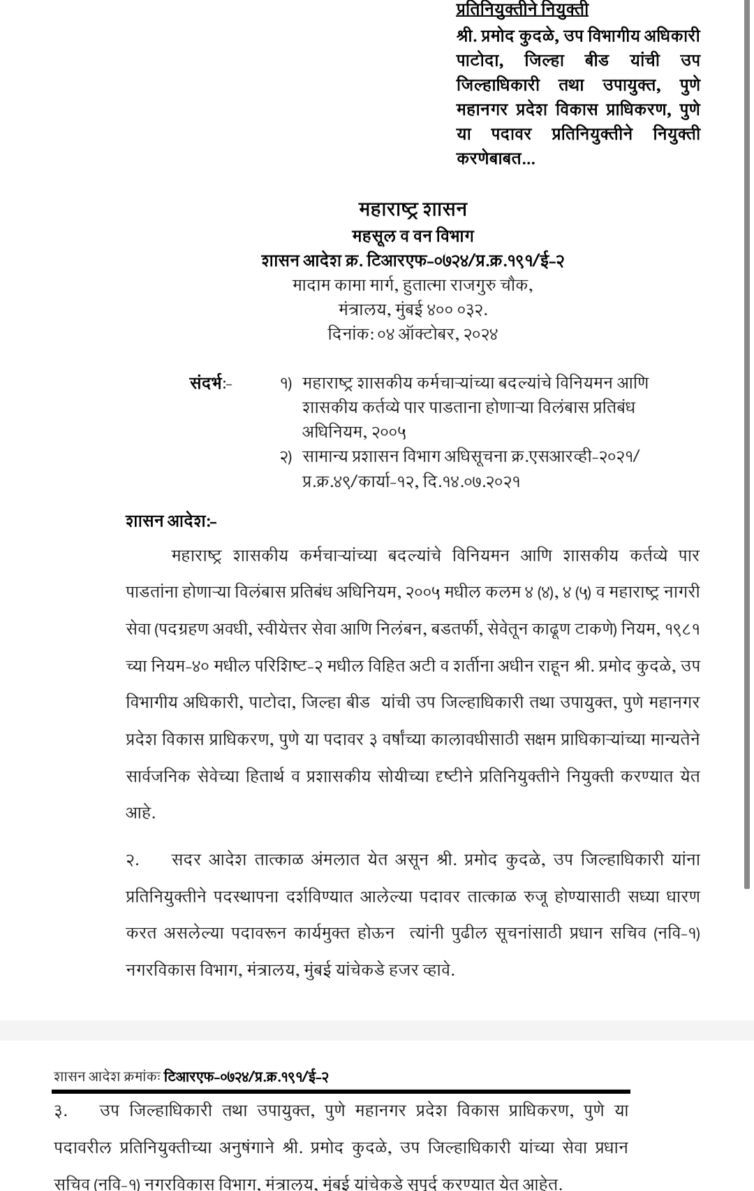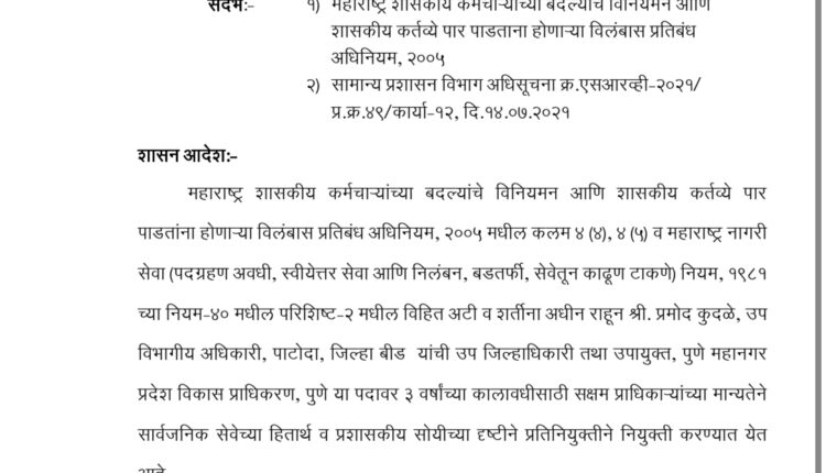 विधानसभा निवडणुकीच्या अनुषंगाने महाराष्ट्र शासनाने अधिकारी यांच्या बदली करण्याचा निर्णय घेतला असून,यामध्ये बीड जिल्ह्यातील पाटोदा येथे उपविभागीय अधिकारी म्हणून कार्यरत असलेले प्रमोद कुदळे यांची उपजिल्हाधिकारी तथा उपायुक्त पुणे,महानगर प्रेदेश विकास प्राधिकरण पुणे या पदावर प्रति नियुक्ती केली आहे.सदरील कुदळे यांना विना विलंब तात्काळ रूजू होण्याचे आदेश शासनाचे उपसचिव महेश वरूडकर यांनी दिले आहे.मात्र,कुदळे यांच्या जागी अजून कोणाचीही नियुक्ती करण्यात आली नाही.