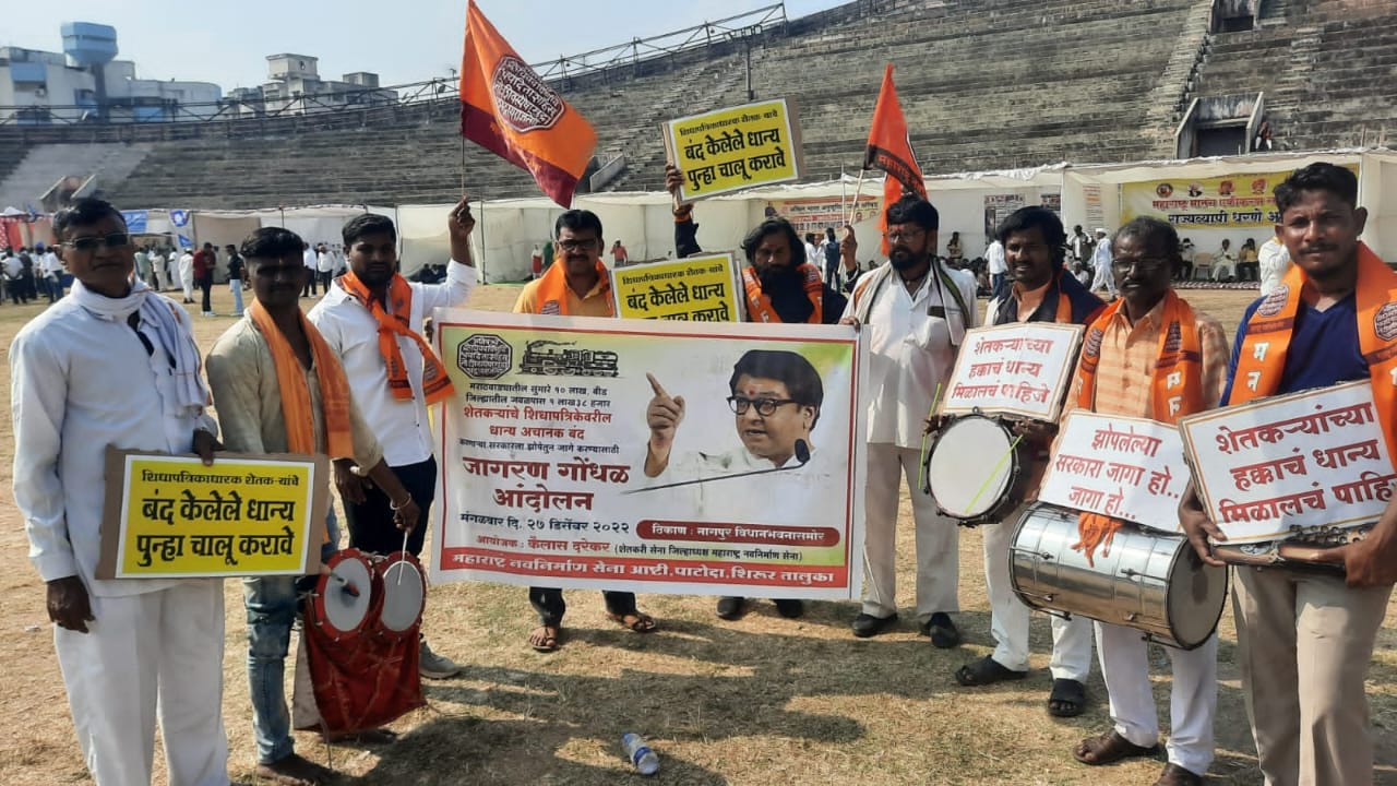 या आंदोलनासाठी दि. 25 रोजी दुपारी कार्यकर्ते नागपूरला रवाना झाले.अंदोलनात मनसे शेतकरी सेनेचे बीड जिल्हाध्यक्ष कैलास दरेकर यांच्यासह मनसे शेतकरी सेनेचे शिरूर तालुकाध्यक्ष सोपान मोरे, आष्टी तालुकाध्यक्ष बाबासाहेब दिंडे,सुनील पाचपुते,जयदीप मिसाळ,लहू भवर,सतीश शिंदे,भरत चव्हाण,अशोक शिंदे आदी या सहभागी झाले होते.रेशन दुकानावर पूर्वी शेतकरी शिधापत्रिकेवर मिळणार धान्य पाच महिन्यांपासून बंद करण्यात आले आहे.शेतकरी शिधापत्रिकेवर पूर्वी आठ-दहा रुपये किलोने लाभार्थींना धान्य मिळत होते.सन 2015 मध्ये फडणवीस सरकारने अन्नसुरक्षा याेजनेअंतर्गत शेतकरी शिधापत्रिकाधारकांना दोन-तीन रुपये किलोने गहू व तांदूळ देण्यास सुरुवात केली.त्यामुळे या शिधापत्रिकाधारकांना दिलासा मिळाला होता. परंतु गेल्या पाच महिन्यांपासून या शिधापत्रिकेवरील धान्य पूर्णपणे बंद करण्यात आले आहे.त्याचा निषेध करीत हे धान्य पूर्ववत सुरू करण्यासाठी सरकारला जाग यावी,म्हणून जागरण गोंधळ अंदोलन करण्यात आले.