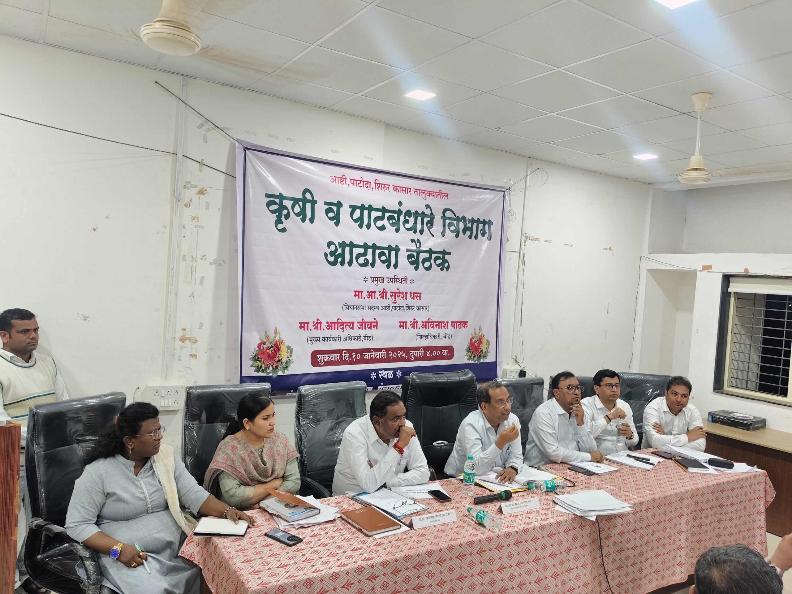 आष्टी पाटोदा शिरूर मतदार संघाची आढावा बैठक आमदार सुरेश धस यांच्या अध्यक्षतेखाली व जिल्हाधिकारी अविनाश पाठक यांच्या उपस्थितीत शुक्रवार (दि.१०)रोजी सायंकाळी ७.३० वा.पंचायत समिती सभागृहात आयोजित करण्यात आली होती.यावेळी आ.सुरेश धस बोलत होते.या प्रसंगी उपविभागीय अधिकारी वसिमा शेख, तहसिलदार वैशाली पाटील यांच्यासह सर्व विभागांचे खातेप्रमुख उपस्थित होते.पुढे बोलतांना आ.धस म्हणाले,मतदार संघातील अर्धवट,किरकोळ राहिलेले कामे अधिकारी व गावक-यांनी मिळवून समझोता करून मार्गी लावावा.जर तुमच्या लेव्हलला ला प्रश्न नाही मिटला तर वरिष्ठ अधिकारी,आणि माझ्याकडे संपर्क साधावा मी तो प्रश्न मार्गी लावीन.यावेळी जिल्हाधिकारी अविनाश पाठक म्हणाले,जे जलजिवनचे काम अर्धवट किरकोळ राहिलेले आहेत ते सर्वांनी मिळवून मार्गी लावावे.यासह विविध विषयांवर चर्चा करत रात्री उशिरा पर्यंत आमदार धस यांनी अधिका-यांशी वन बाय वन चर्चा करत सुचेना देण्यात आल्या.