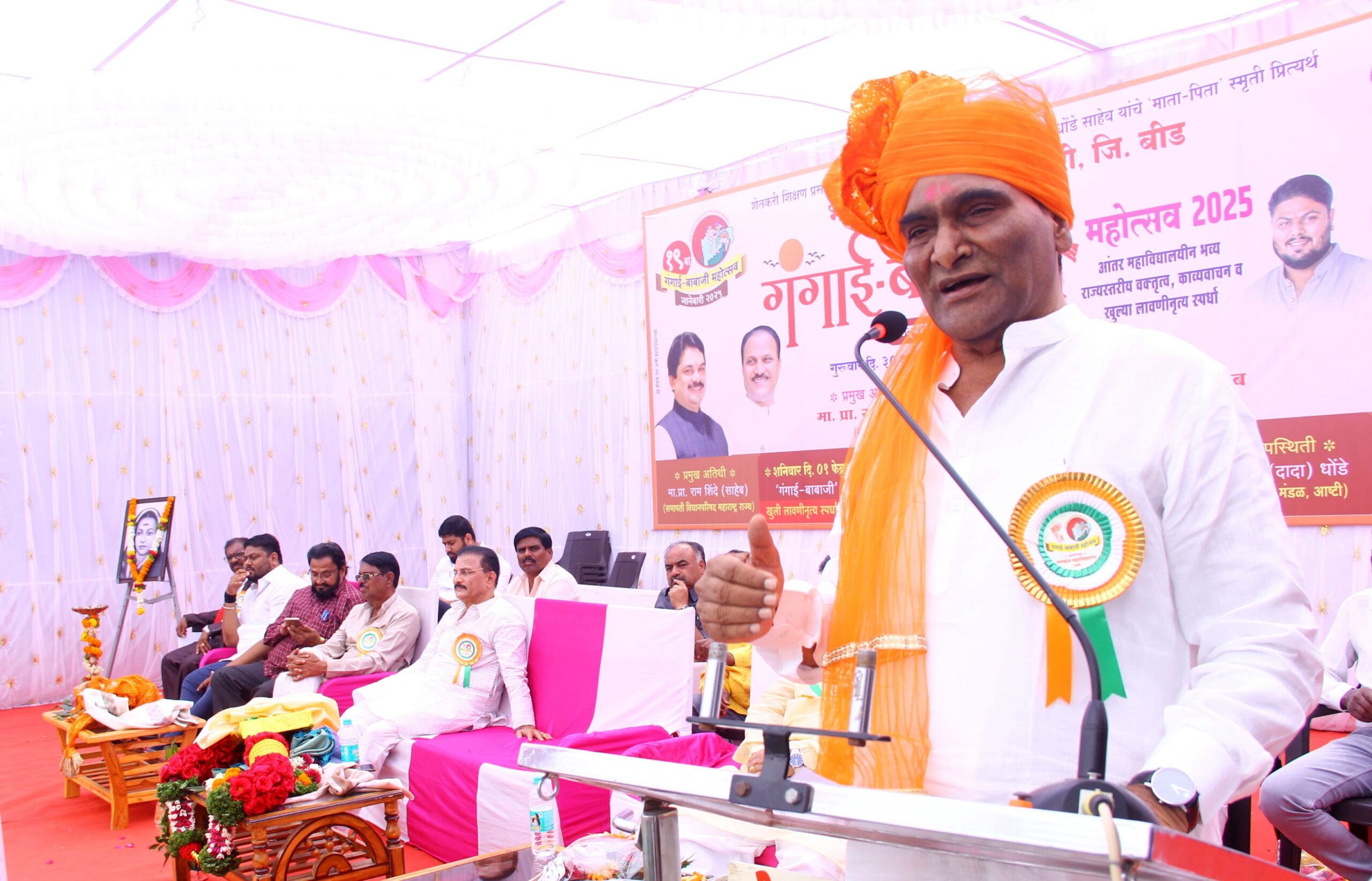 त्याचा फायदा नगर आणि बीड जिल्ह्यातील रुग्णांना नक्की होईल.आपल्या आई-वडिलांची आठवण दरवर्षी यावी म्हणून, त्याच बरोबर शाळा महाविद्यालयातील विद्यार्थ्यांना प्रेरणा व प्रोत्साहन मिळावे. कला, साहित्य,संस्कृतीचे संवर्धन व्हावे.यासाठी गंगाई-बाबाजी महोत्सव सुरू केला आहे.या महोत्सवाच्या माध्यमातून आत्तापर्यंत अनेक कलावंत, लेखक,साहित्यिक,खेळाडू घडले आहेत.दरवर्षी आपण समाजातील विविध क्षेत्रात चांगले काम करणाऱ्या गुणवंतांचा विविध पुरस्कार देऊन सत्कार करतो.विद्यार्थ्यांनो कुठलीही व्यसने करू नका, भरपूर अभ्यास करा,व्यायाम करा शरीरयष्टी कमवा.केवळ पोलीस भरती आणि मिलिटरी भरतीसाठी सराव करू नका,तर विविध स्पर्धेत भाग घ्या. त्या माध्यमातून तुम्हाला मोठे अधिकारी होता येईल आणि आपले जीवन समृद्ध करता येईल असे ते म्हणाले.प्रा. सुरेश नवले म्हणाले, नव्या पिढीच्या मनात चांगले विचार रुजविण्यासाठी तसेच बिघडलेली सामाजिक स्थिती बदलण्यासाठी गंगाई बाबाजी सारख्या महोत्सवांची गरज आहे.मायबापांना देवाचे स्वरूप देणारे मा.आ.भीमराव धोंडे हे आदर्श समाज निर्माण व्हावा म्हणून गंगाई-बाबाजी महोत्सवाच्या माध्यमातून प्रयत्न करीत आहेत. महाराष्ट्र ही पुण्य भूमी आहे.वज्र भूमी आहे.महाराष्ट्र धर्म वाढविण्यासाठी हजारो वारकरी आणि मावळे दरवर्षी घराबाहेर पडतात.त्यामुळेच या राज्यात महाराष्ट्र धर्म टिकून आहे.या महाराष्ट्रात ठीक ठिकाणी वेगवेगळे महोत्सव साजरे होतात परंतु आपल्या आई-वडिलांच्या नावाने होणारा आष्टीतील हा एकमेव महोत्सव आहे.गंगाई-बाबाजी महोत्सव हा साहित्यिक व सांस्कृतिक ठेवा आहे.त्याचे यु-टुब च्या माध्यमातून जतन करणे गरजेचे असल्याचे त्यांनी सांगितले.यावेळी मा.आ.राजेंद्र जगताप यांना जीवनगौरव पुरस्कार देऊन सन्मानित करण्यात आले.यावेळी मा.आ.जनार्दन तुपे, मा.आ.राजेंद्र जगताप,प्राचार्य अनंत हंबर्डे यांचीही भाषणे झाली. क्रांतीज्योती सावित्रीबाई फुले यांच्या प्रतिमेस अभिवादन करून या महोत्सवाचे उद्घाटन झाले.प्राचार्य डॉ.दत्तात्रय वाघ यांनी प्रास्ताविक केले.प्रा.डॉ.बाळासाहेब गावडे यांनी सूत्रसंचालन केले.प्रा.सूर्यकांत धोंडे यांनी वार्षिक क्रीडा अहवाल सादर केला.प्रा.श्रीकांत धोंडे यांनी आभार मानले.कार्यक्रमाच्या यशस्वितेसाठी उपप्राचार्य प्रा.डॉ.ज्ञानदेव वैद्य, उपप्राचार्य प्रा.डॉ.अप्पासाहेब टाळके,उपप्राचार्य प्रा.सुनील भवर,प्रा.डॉ.आबासाहेब पोकळे,प्रा.डॉ.वंदना घोडके यांनी परिश्रम घेतले.कार्यक्रमास महाविद्यालयाचे विद्यार्थी,विद्यार्थिनी,प्राध्यापक व आष्टीतील प्रतिष्ठित नागरिक मोठ्या संख्येने उपस्थित होते.