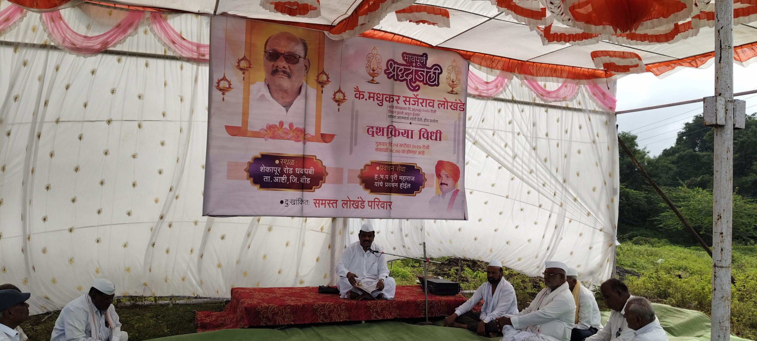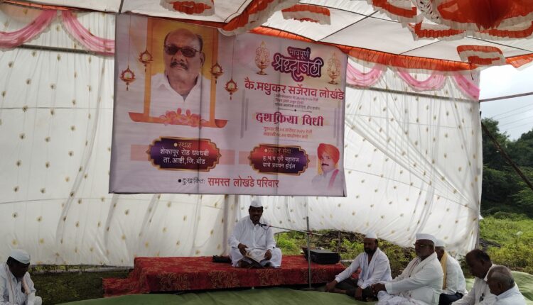 आष्टी येथील महाराष्ट्र सरकार ग्रुपचे अध्यक्ष सचिन लोखंडे यांचे वडील कै.मधुकर सर्जेराव लोखंडे यांच्या दशक्रिया विधी निमित्ताने गुरूवार (दि.४)रोजी सकाळी ८ ते १० यावेळेत आष्टी येथील ह.भ.प.श्रीहरी पुरी यांचे प्रवचन संपन्न झाले.यावेळी माजी आमदार साहेबराव दरेकर,देविदास धस, ह.भ.प.चंद्रभान मसलेकर महाराज,सविता गोल्हार,जयदत्त धस,डॉ. शिवाजी राऊत,राजेंद्र धोंडे,अदिनाथ सानप, अमरराजे निंबाळकर, गोरख तरटे,संजय गावडे,भागचंद झांजे,पत्रकार उत्तम बोडखे,सचिन रानडे,गणेश दळवी,शरद रेडेकर यांच्यासह आष्टी तालुक्यातील राजकीय, धार्मिक,सामाजिक क्षेत्रातील व नातेवाईक मोठ्या संख्येने उपस्थित होते.ह.भ.प.श्रीहरी पुरी यांनी “ठेविले अनंते तैसेची रहावे” हा संत तुकाराम महाराजांच्या एका अभंगाचा भाग घेतला,ज्याचा अर्थ ‘ईश्वराने आपल्याला जसे ठेवले आहे,तसेच आनंदाने राहावे’असा आहे.या अभंगात संत तुकाराम महाराज म्हणतात की देवाने जी परिस्थिती निर्माण केली आहे,त्यात समाधान मानून राहावे.तसेच, संसारातील कोणत्याही गोष्टीचा उद्वेग न करता,आपल्या कर्माचे फळ भोगावे आणि सर्व भार ईश्वरावर सोपवून त्याच्या भक्तीत लीन व्हावे,असेही ह.भ.प.पुरी यांनी सांगितले