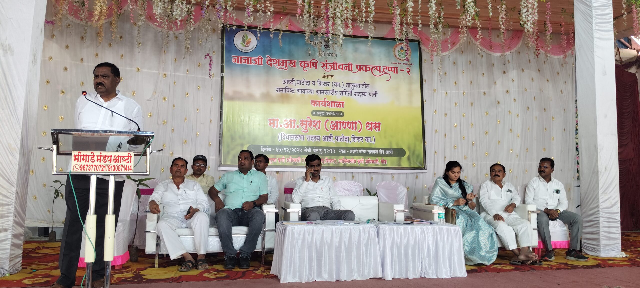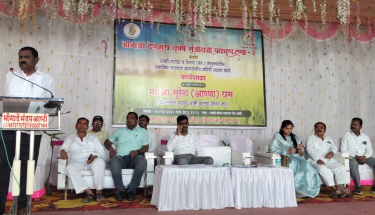 महाराष्ट्र शासनाच्या कृषी विभागाच्या वतीने नानाजी देशमुख कृषी संजीवनी प्रकल्प टप्पा-२ अंतर्गत आष्टी, पाटोदा व शिरूर (कासार) तालुक्यातील समाविष्ट गावांच्या ग्रामस्तरीय समित्यांसाठी शहरातील लक्ष्मी लॉन्स येथे शनिवार (दि. २७) रोजी दुपारी १.३० वाजता आयोजित कार्यशाळेत ते बोलत होते.यावेळी व्यासपीठावर विभागीय कृषी अधिकारी उध्दव गर्जे, आष्टी तालुका कृषी अधिकारी गोरख तरटे, पाटोदा तालुका कृषी अधिकारी शेळके, शिरूर (का.) तालुका कृषी अधिकारी गांगर्डे, पाटोदा कृषी उत्पन्न बाजार समितीचे सभापती किरण शिंदे,सरपंच विद्या गायकवाड, नगराध्यक्ष जिया बेग,माऊली जरांगे,गणेश शिंदे,महेंद्र गर्जे,राजेंद्र दहातोंडे आदी मान्यवर उपस्थित होते.