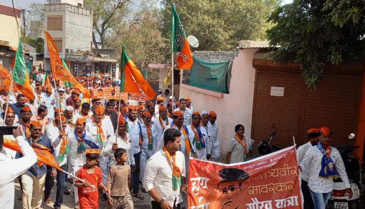स्वातंत्र्यवीर सावरकरांच्या प्रतिमेस पुष्पहार अर्पण करून यात्रेचा शुभारंभ करण्यात आला.यात्रेत सहभागी झालेल्या कार्यकत्यांनी मी सावरकर’या आशयाच्या टोप्या परिधान केल्या होत्या भारतीय जनता पार्टी स्थापना दिनानिमित्त संपर्क कार्यालया समोर मा. आ. धोडेंच्या हस्ते ध्वजारोहण करण्यात आले.या रॅलीत सभास्थळी प्रत्येक नेते पदाधिकारी मी सावरकर अशा अशायाच्या टोप्या भारतीय जनता पार्टी चे ध्वज, पंचे परिधान करून उपस्थित होते. महेश बँकेच्या प्रांगणात सभेचे आयोजन करण्यात आले होते. यावेळी अॅड. वाल्मिक तात्या निकाळजे, साहेबराव म्हस्के, श्रीधरपंत सहस्रबुद्धे, युवा नेते अजय धोंडे, सुनिल सानप, दादा झांजे आदींनी मनोगत व्यक्त केले. या गौरव यात्रेत मा.आ.भिमरावजी धोंडे, युवा नेते अजय धोंडे,अभयराजे धोंडे, अॅड. वाल्मिक तात्या निकाळजे, जिल्हा सरचिटणीस शंकर देशमुख, बबन झांबरे, भाजपा तालुकाध्यक्ष अॅड. साहेबराव म्हस्के, डॉ.शैलजा गर्जे, अॅड. नवनाथ विधाते, सरपंच सावता ससाणे, रघुनाथ शिंदे, सरपंच दादा जगताप, सरपंच अभय गर्जे,महाराष्ट्र केसरी सय्यद चाऊस,नगरसेवक ज्ञानदेव राऊत,बाबु कदम,दादा झांजे,बबन औटे,दत्तात्रय गिलचे,नवनाथ सानप, बाळासाहेब पवार,सरपंच विष्णू दहिफळे,सरपंच ज्ञानेश्वर वाघ,संजय मिसाळ, सुनिल सानप, आदींसह नागरीक मोठ्या संख्येने उपस्थित होते.कार्यक्रमाचे सुत्रसंचलन शंकर देशमुख यांनी तर आभार बाळासाहेब पवार यांनी मानले माजी जन्मठेप या पुस्तकाचे प्रत्येकाने वाचन करण्याचे आवाहन मा.आ.भिमरावजी धोडे यांनी शेवटी केले.