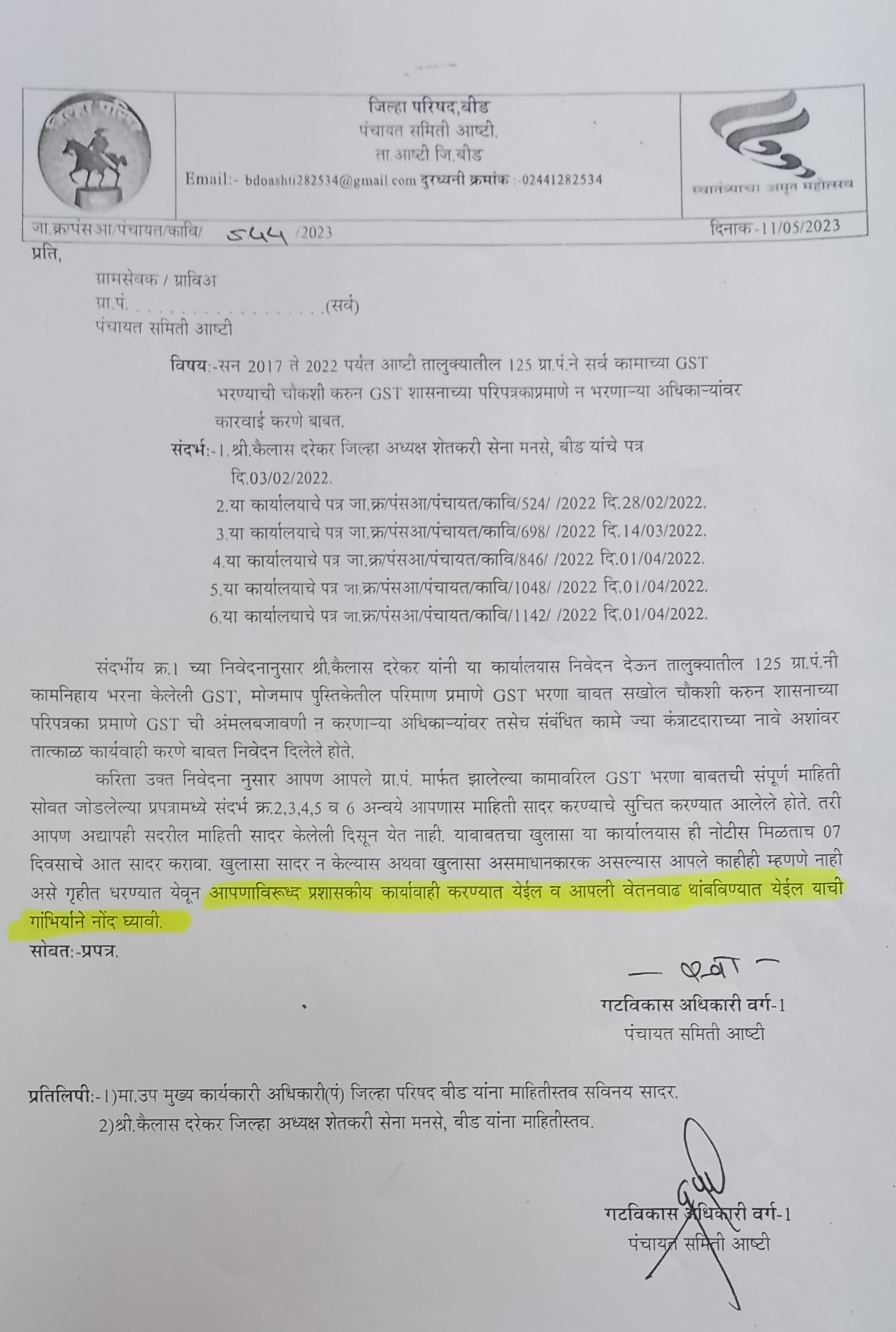 आष्टी तालुक्यातील १२५ ग्रामपंचायतने सन २०१७-२०२२ पर्यंत १५ व्या वित्तआयोगाअंतर्गत केलेल्या कामनिहाय भरना केलेले GST मोजमाप पुस्तकेतेतील परिणाम प्रमाणे GST भरणा बाबत सखोल चौकशी करून शासनाच्या परिपञकाप्रमाणे GST ची अंमलबजावणी न करणा-या अधिका-यांवर व संबंधित कामे ज्या कंञाटदारांच्या नावे आहेत.आशावर तात्काळ कारवाई करण्याची तक्रार महाराष्ट्र नवनिर्माण शेतकरी सेनेचे जिल्हाध्यक्ष कैलास दरेकर यांनी दि.३ फेब्रुवारी २०२३ रोजी गटविकास अधिकारी यांच्याकडे केली होती.या तक्रारीचे गटविकास अधिकारी यांनी दखल घेत आज दि.११ मे रोजी तालुक्यातील १२५ ग्रामपंचायतच्या ग्रामसेवकांना खुलसा सादर करण्याचे दिले असून,सात दिवसांत यावर ग्रामसेवकांनी माहिती सादर न केल्यास अथवा माहिती असमाधानकारक असल्यास वेतनवाढ थांबविण्यात येणार असल्याचे या पञात आदेश देण्यात आला आहे.